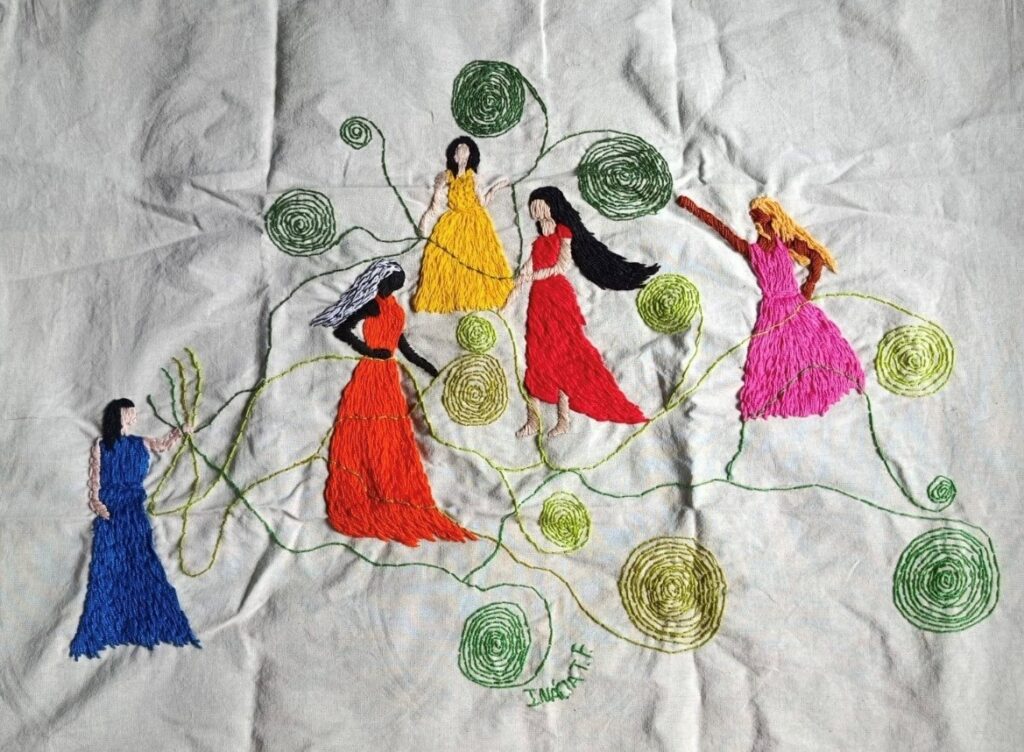 Enseignante en maternelle, elle brode pendant son temps libre, créant des compositions poético-visuelles sans suivre de techniques ni de modèles, laissant le geste se déployer sur le tissu et transmettant, à chaque point, légèreté et mouvement.